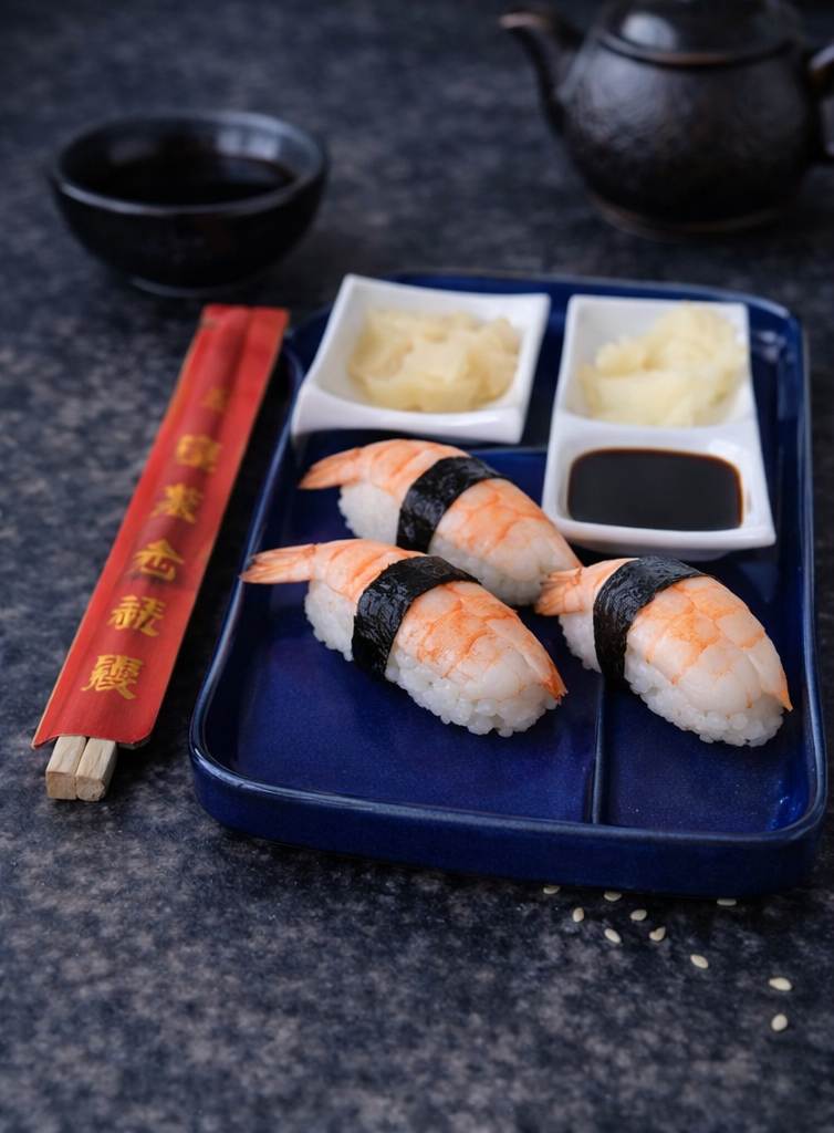 Karides nigiri (2 adet) ve ebi karidesle (8 adet) hazırlanan özel mix tabak.